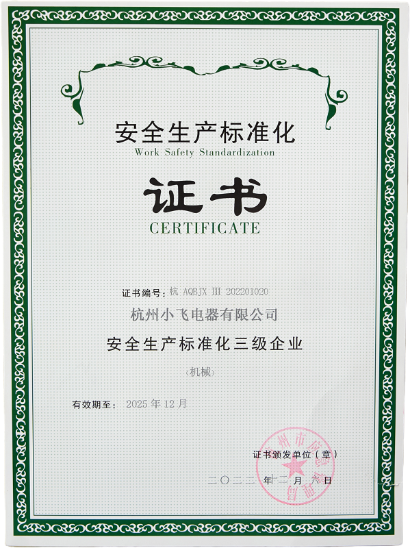 公司总部设在杭州,拥有完整、科学的质量管理体系。公司的诚信、实力和产品质量获得业界的认可。欢迎各界朋友莅临杭州小飞电器有限公司参观、指导和业务洽谈。